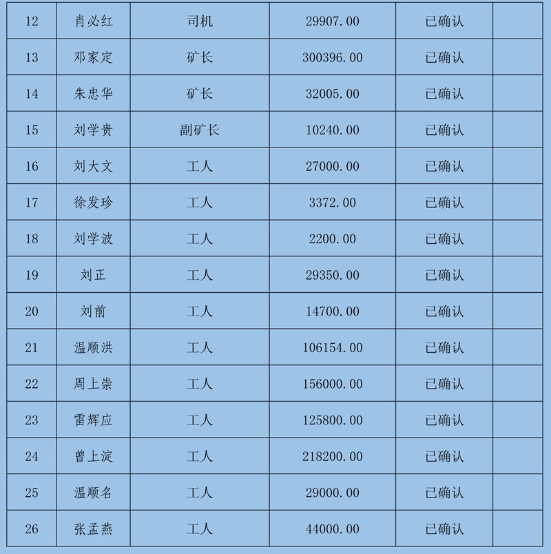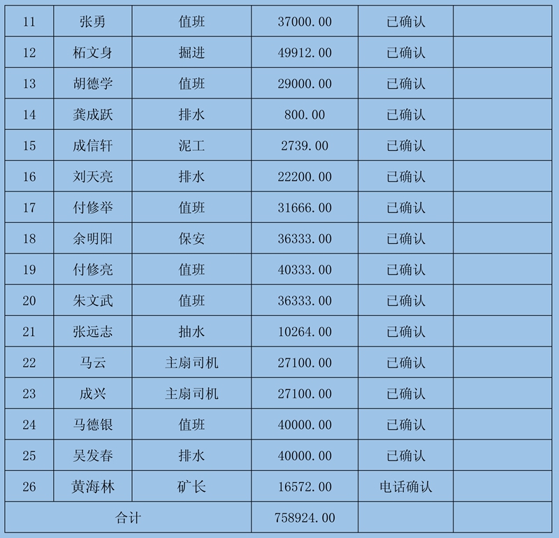 2、本次確認(rèn)情況:經(jīng)初核確認(rèn),累計(jì)共收到25條欠薪證據(jù),涉及25人742352元;勞資雙方已簽字蓋章確認(rèn)25條欠薪證據(jù);經(jīng)法人陽(yáng)建華電話確認(rèn)1人16572元。煤礦方提供確認(rèn)名冊(cè)一份,其他50名欠薪人員存在以下說(shuō)明:3名人員證據(jù)不足無(wú)法確認(rèn)、10名(兩個(gè)工隊(duì))待法院判決后再確認(rèn)、16名人員欠薪已支付、21名人員由于證據(jù)不足無(wú)法確認(rèn)。