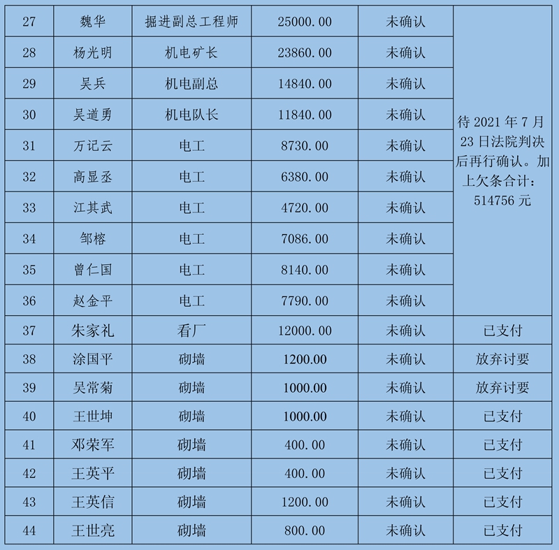 3、其他情況:登記確認(rèn)過(guò)程中魏華、楊光明兩個(gè)工隊(duì)提供欠薪相關(guān)證據(jù),但由于兩個(gè)工隊(duì)的上級(jí)主管歐秀坤已向法院提起訴訟,于2021年7月23日開庭,煤礦表示不知道歐秀坤的訴訟里面是否含兩個(gè)工隊(duì)的欠薪,待查明情況后再做確認(rèn)。