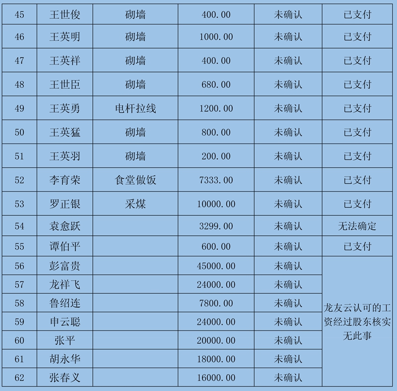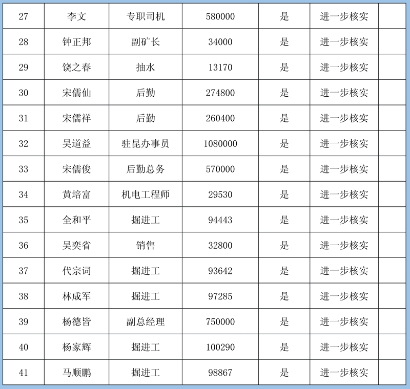 4、復(fù)核組意見:①煤礦管理方新提交的5份5人627萬(wàn)元欠薪資料因證據(jù)不足暫緩確認(rèn);②羅克雄1415434元雖然提供的證據(jù)充足,但由于他是公司的總經(jīng)理且金額較大,需要再次確認(rèn);③其他40條欠薪證據(jù)屬實(shí),涉及40人2534935元可以確認(rèn)。