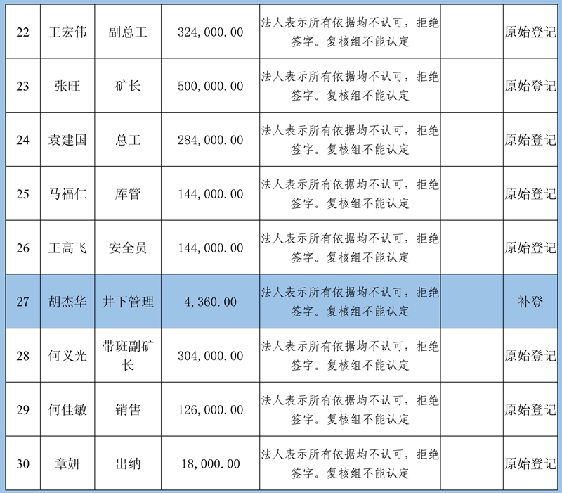 4、復(fù)核意見:煤礦方現(xiàn)法人以所有欠薪依據(jù)無(wú)法核實(shí)為理由拒絕簽字認(rèn)可所有欠薪申報(bào)。不予確認(rèn)兩條(王國(guó)超申報(bào)工資324000元屬掛證費(fèi)用,張為民法人工資9066600元);其余135條申報(bào)因煤礦方原因暫不能確認(rèn)。