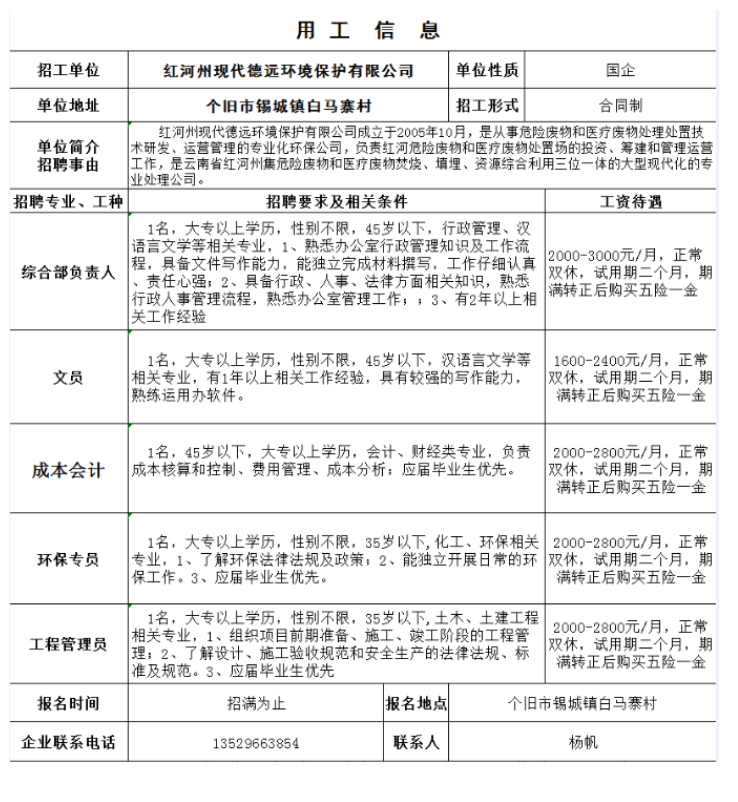 紅河州現代德遠環(huán)境保護有限公司招聘信息