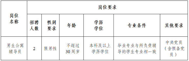 為進一步加強學校專職輔導員隊伍建設,經(jīng)學校研究,學校決定招聘2名編制外合同制專職輔導員,具體招聘有關事項公告如下:
