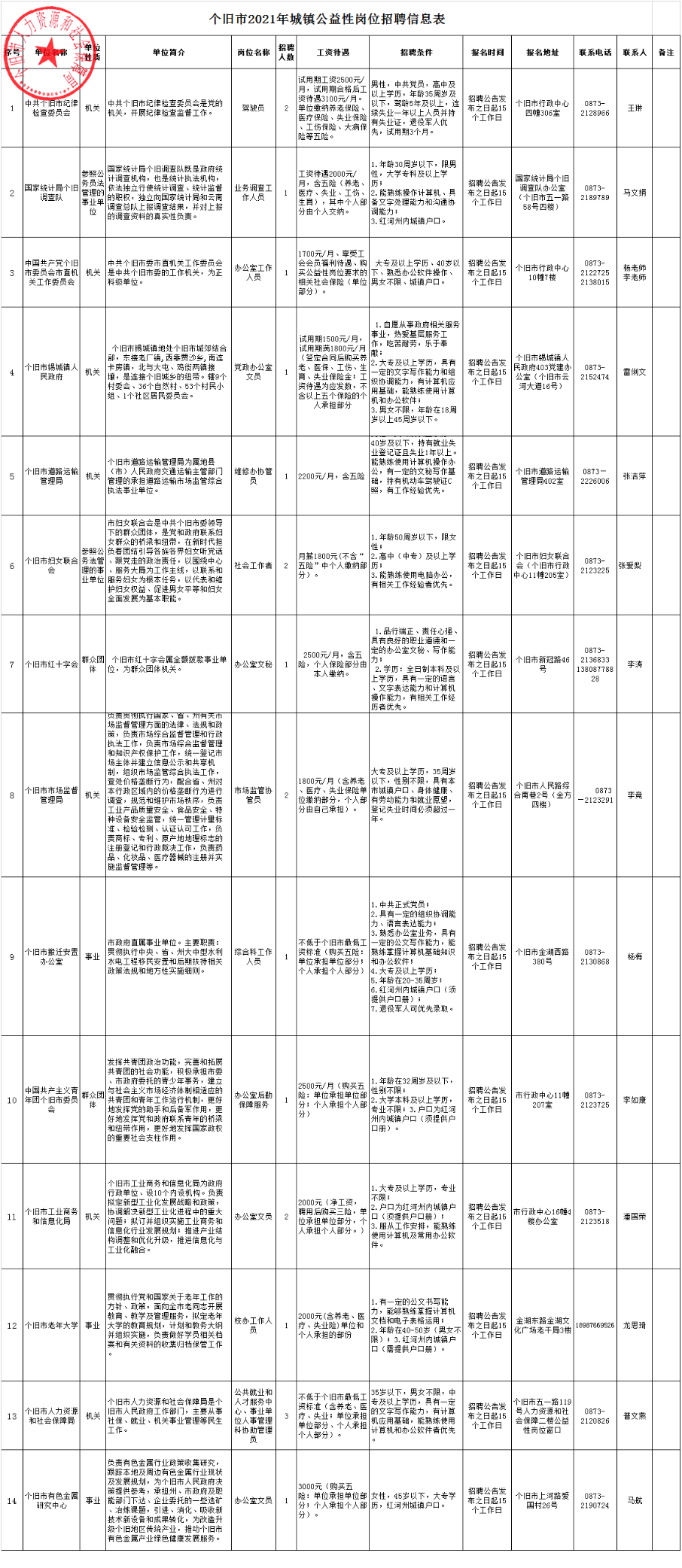 招聘崗位由招聘單位編報,招聘專業(yè)、學(xué)歷等與崗位資格條件相關(guān)的問題,由招聘單位負責(zé)解釋。詳見《個舊市2021年城鎮(zhèn)公益性崗位招聘信息表》。