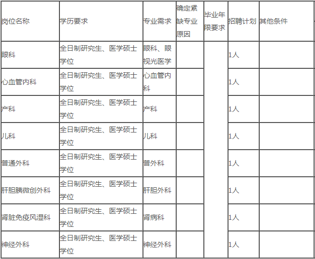 (一)市人民醫(yī)院。引進崗位8個,其中眼科1個、心血管內(nèi)科1個、產(chǎn)科1個、兒科1個、普通外科1個、肝膽胰微創(chuàng)外科1個、腎臟免疫風濕科1個、神經(jīng)外科1個。