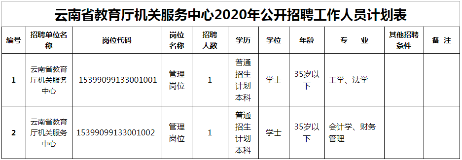 公開招聘管理崗位工作人員2名;凡符合條件的人員均可報名參加本次公開招聘。招聘范圍和條件(詳見附件1《云南省教育廳機關(guān)服務(wù)中心2020年公開招聘計劃表》),年齡計算截止日期2020年9月1日。